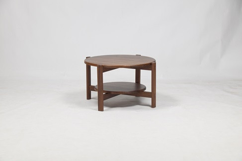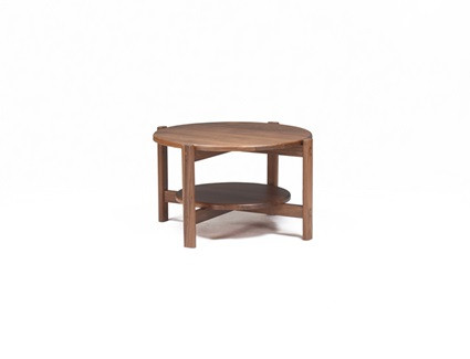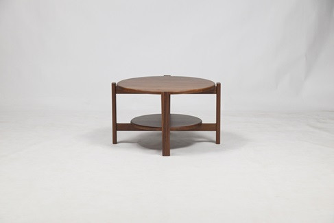 棚板付きのラウンド形コーヒーテーブル。天板の端や脚にも角などを丸くする処理する加工(R加工)を施し、柔らかな印象を与えるテーブルです。