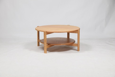 棚板付きのラウンド形コーヒーテーブル。天板の端や脚にも角などを丸くする加工(R加工)を施しております。柔らかな印象を与えるテーブルです。
