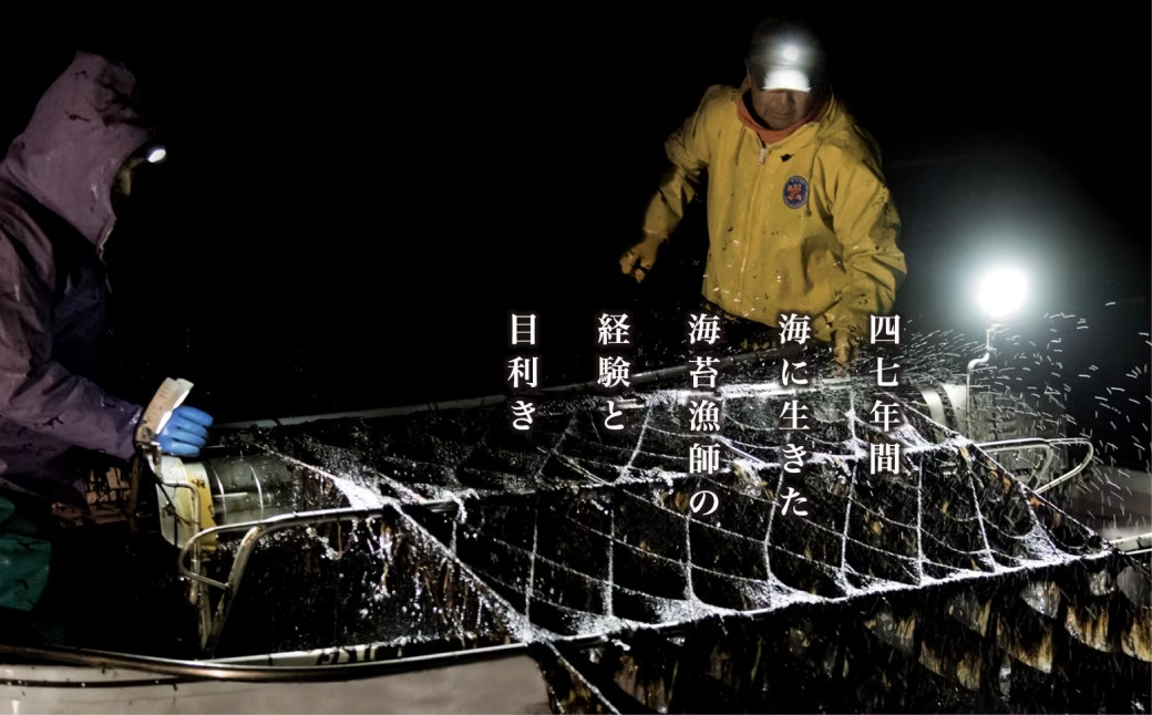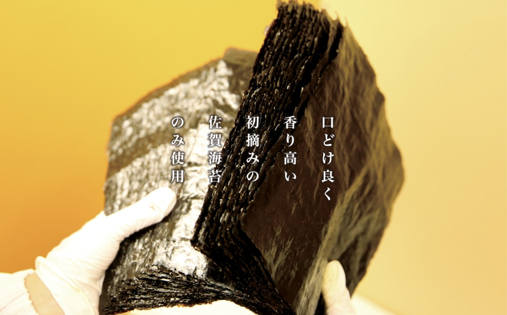 焼き海苔:日本の伝統を今に伝える佐賀海苔の中でも初摘みだけを使用。香高く、深くしっとりとした旨みと口どけの初摘み海苔の美味しさそのものを
