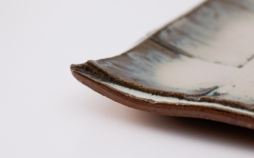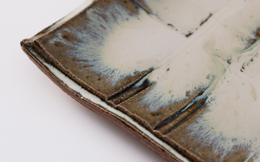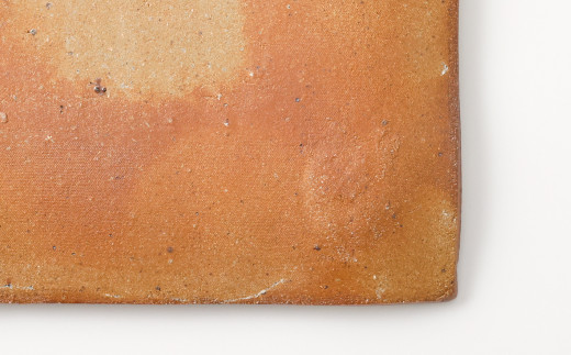 こちらは藁灰釉を用いてつくられる、斑唐津の陶板です。藁灰釉の表面が斑状になることから斑唐津と呼ばれています。力強くかかった斑唐津のグラデーションがとてもきれいな陶板です。皿立てに掛けて飾り皿としてもお楽しみいただけます。
