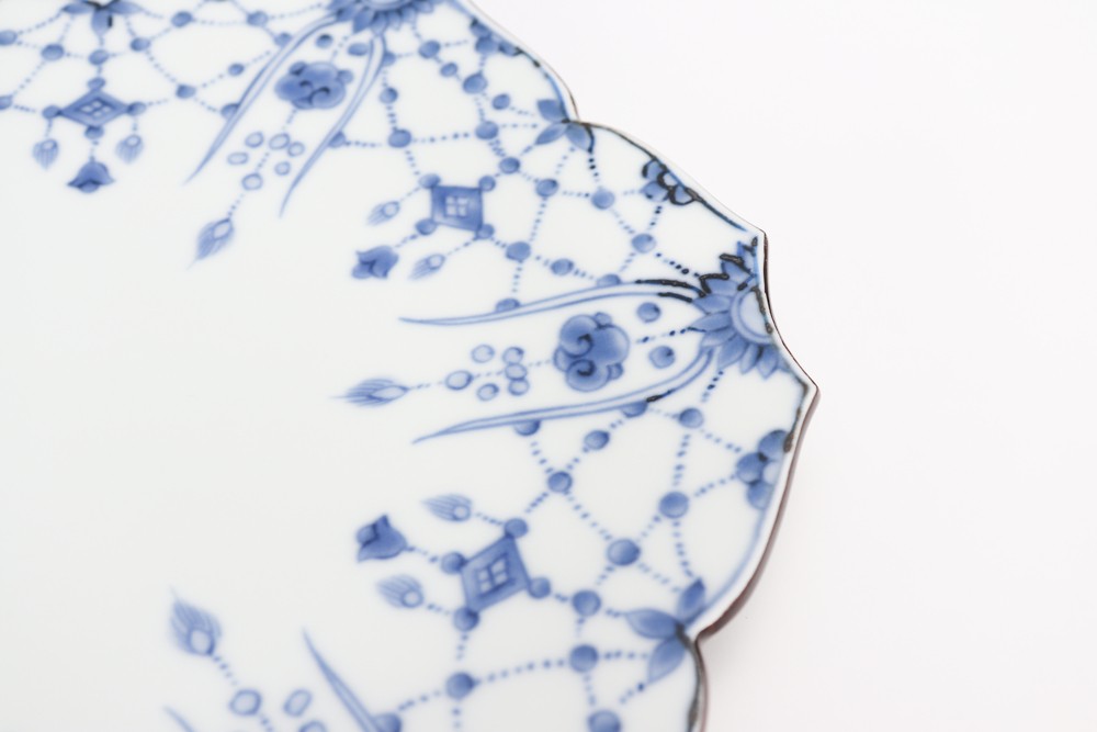古代インドの貴族が身につけていた装身具をモチーフにした紋様の「瓔珞紋」 【有田焼】錦右ェ門窯 染付瓔珞紋 輪花23cmプレート 丸兄商社