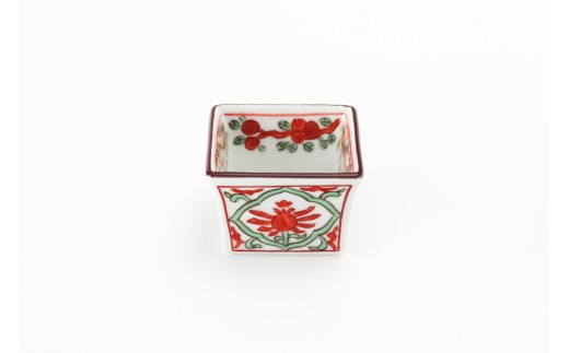 アイボリー色の下地に花万歴が描かれたお皿と豆鉢、赤・緑・黄で華やかに描かれた正角小付の3点セットです。
