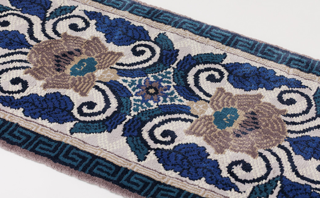 花牡丹唐草格子地と同じ「手織」の技が光る緞通の敷物
