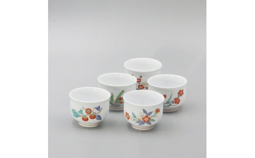 名窯「柿右衛門窯」の汲出碗5客そろえ。絵変わりの繊細な絵付けをお楽しみください