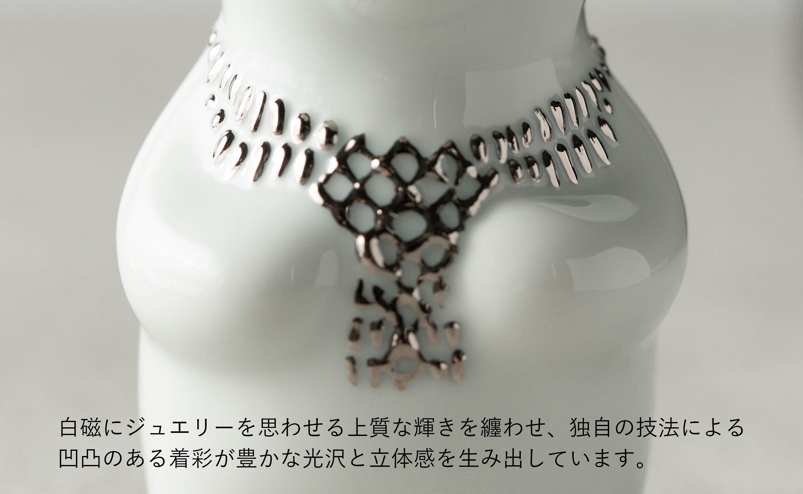 本作は、聡窯の若手作家・辻拓眞さんによる一点。白磁にジュエリーを思わせる上質な輝きを纏わせ、独自の技法による凹凸のある着彩が豊かな光沢と立体感を生み出しています。洗練された絵付けがもたらす存在感と、手仕事ならではの繊細な揺らぎが魅力で、見る角度によって印象が変わる美しさも楽しめます。聡窯代々の技を受け継ぎながら、自らの表現を追求する辻さんならではの、気品と現代性を備えた作品です。