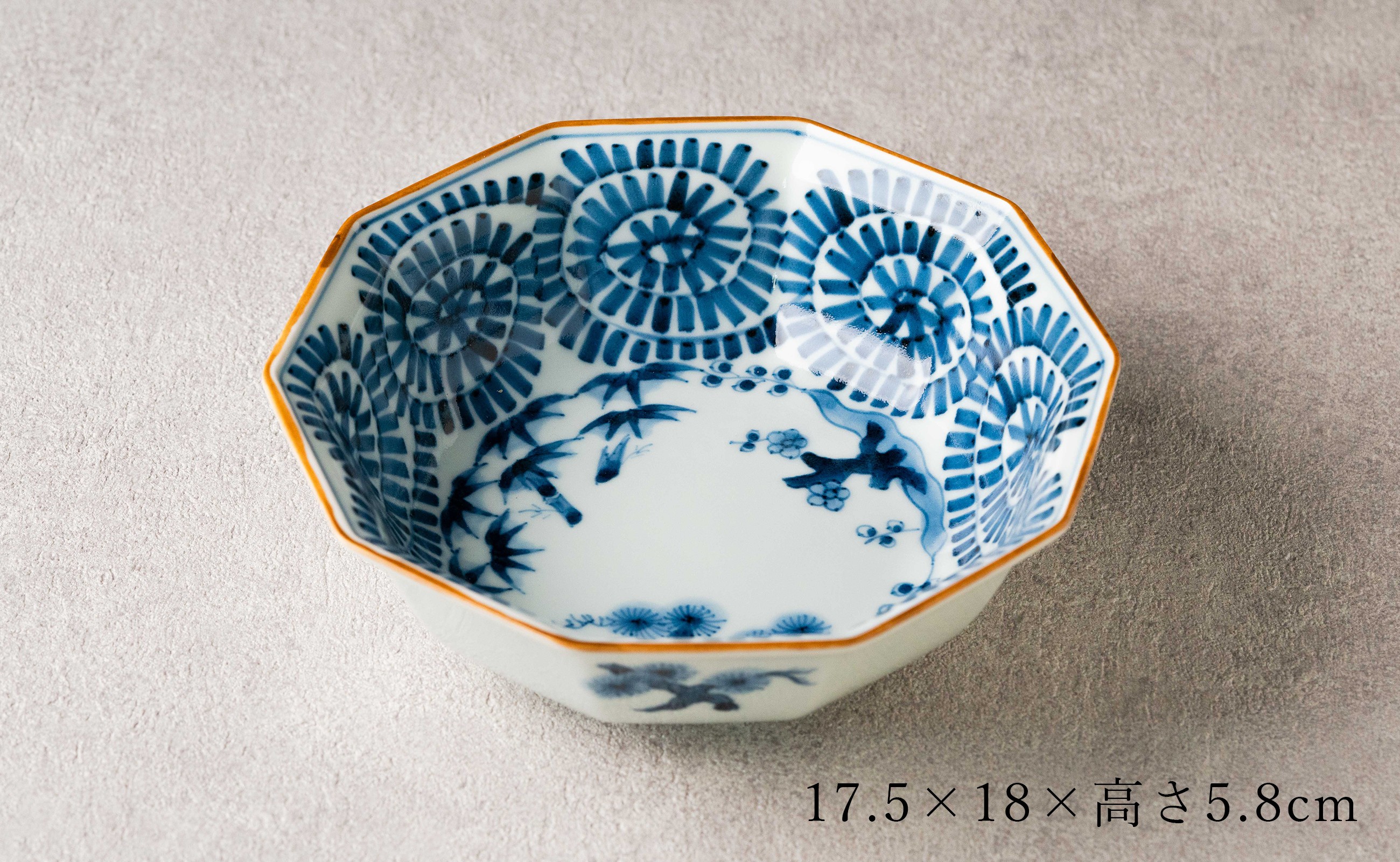 チョイス限定 華やかな染付模様が美しい十角の鉢。日常使い贈り物にも最適。/ボウル 食器 有田焼 【カネアオ】 有田焼 18cm 十角菓子鉢 ボウル 染付 松竹梅蛸唐草 1枚 宝泉窯