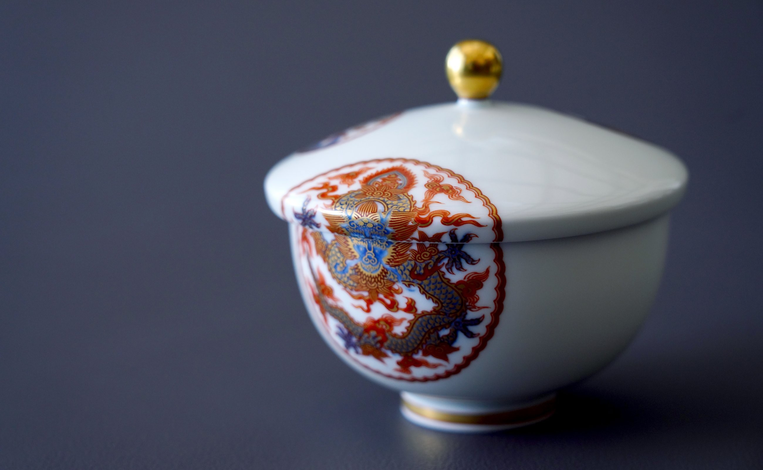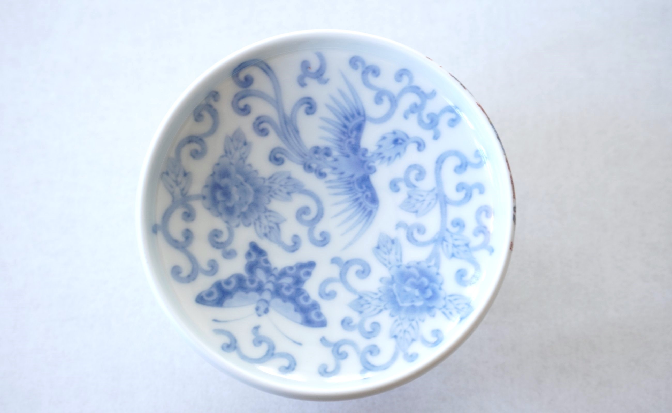 湯呑には竜・鶴・崑崙山・楓のデザイン、土瓶には亀・鯉・獅子牡丹・鳳凰・山水・花籠の吉祥丸紋がバランスよく豪華に描かれています。湯呑の蓋裏側には、染付の唐草と蝶を配した図案がまた違った表情を見せてくれます。繊細なタッチと白磁の空間が生きた格調高い茶器揃です。湯呑内面の白磁が美しくお茶の色を引き立て、おもてなしの場をより引き立てます。