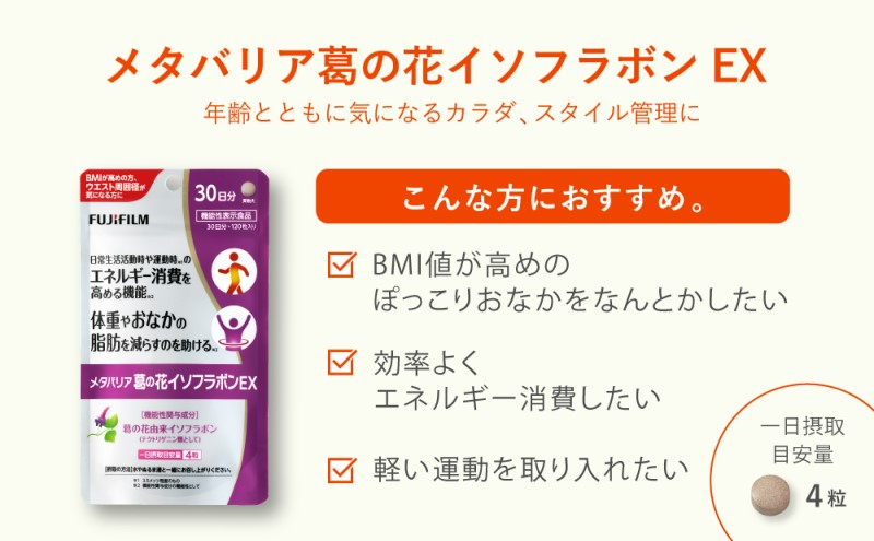 メタバリア葛の花イソフラボンEXは、おなかの脂肪や体重が気になる方、 普段忙しく習慣的な運動に取り組めていない方、ウォーキングなど軽い運動を取り入れている方の健康習慣をサポートするサプリメントです。葛の花由来イソフラボンが日常生活活動や運動時(*1)のエネルギー消費を高めます。*1 3.5メッツ程度のもの