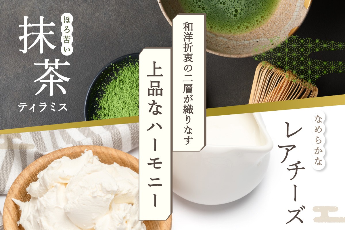 贅沢に抹茶ティラミスとレアチーズの二層仕立てチーズケーキを詰め込みました。