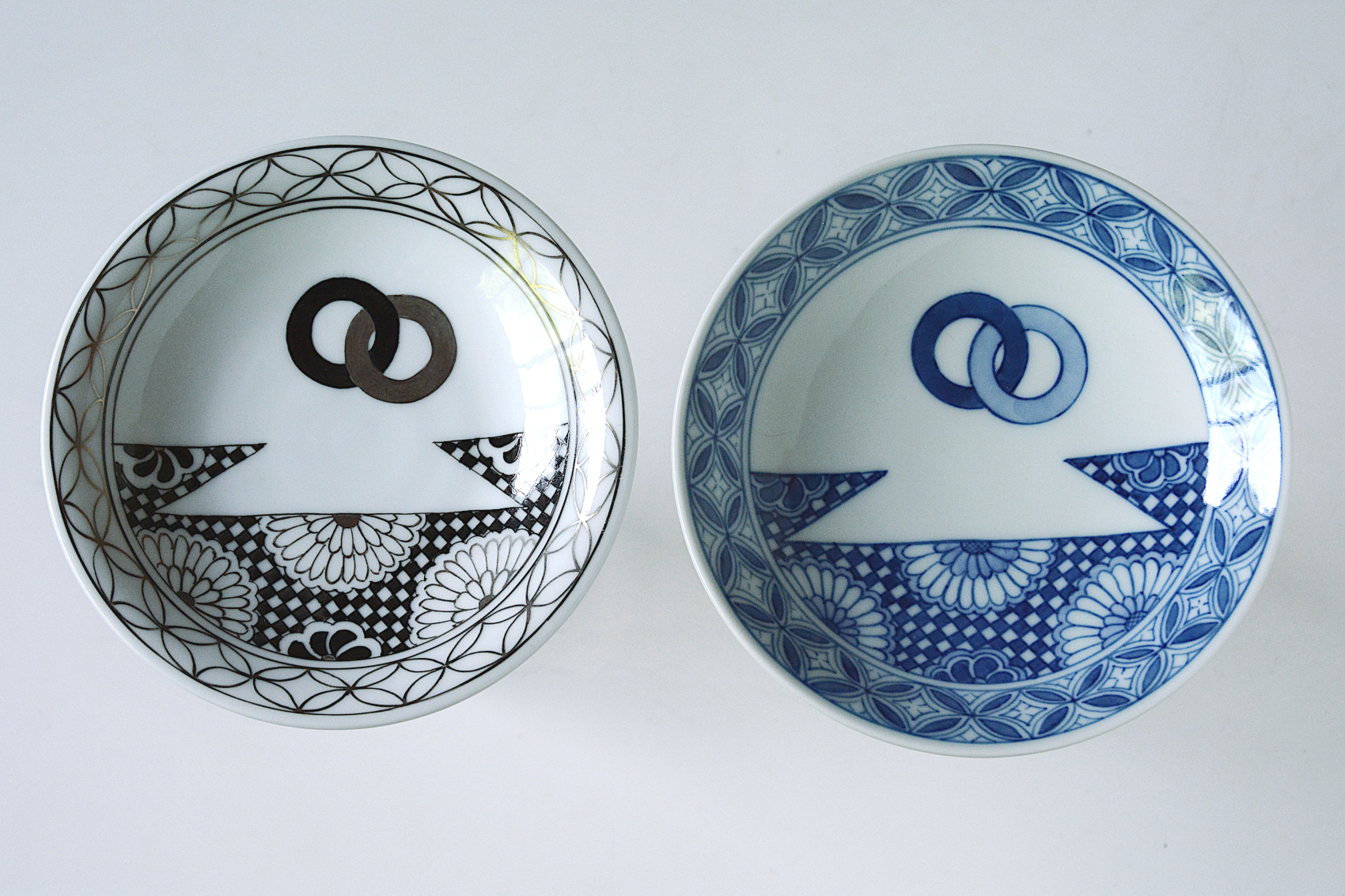 1600年代に作られた「染付菱割輪繋菊花文皿」があまりにも大胆で面白い構図なので、写しを制作。同じデザインを現代風にアレンジしした皿とセットにしました。全て手造りで制作しております。