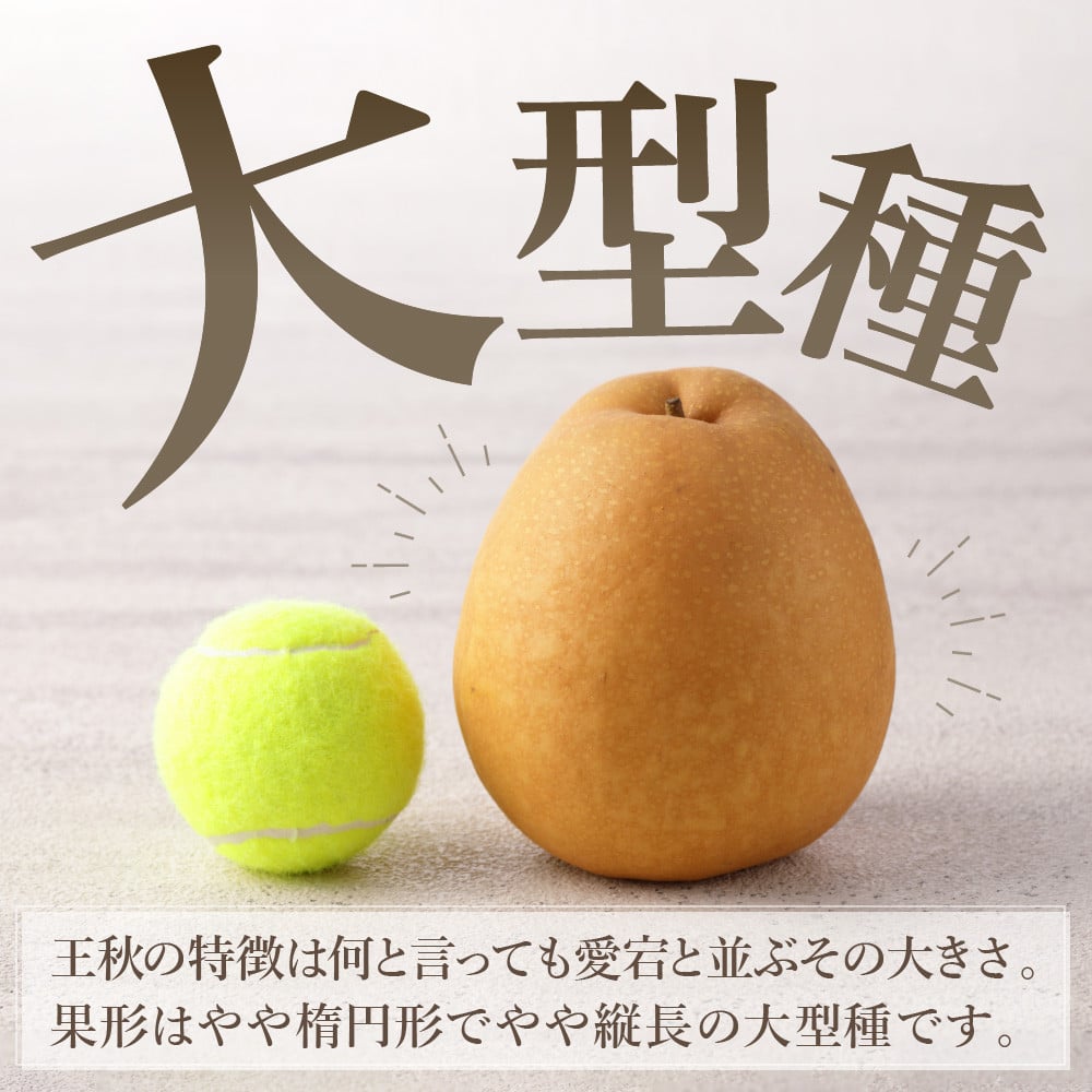 【2026年産先行予約】 ●白く緻密で水々しい果肉が自慢 ●柔らかな歯ざわりと優しい酸味 王秋の特徴は何と言っても愛宕と並ぶその大きさです。 果形はやや楕円形でやや縦長の大型種。 (重量比較:幸水を1とした場合、王秋は1.97) 果肉は白くとっても緻密、加えてとてもみずみずしく、歯ざわりはやわらかく、甘みに酸味が加わった上品な味に仕上がっています。 愛宕とともに伊万里の特別梨です。ぜひこの機会にお試しください。 お届けは2026年10月中旬~10月下旬まで予定です。 ※玉数のご指定はできませんので、ご了承ください。 ※簡易熨斗ご準備しています。ご希望の場合は備考欄にご記入ください。 【JA伊万里】 ●写真はイメージです。 ●不在日がございましたら、申し込みの際の備考欄にご記入ください。 ●申し込み後に不在日ができた場合は、サポート室にご連絡ください。 伊万里市ふるさと納税サポート室 0955-58-9930 support@furusato-imari.jp ●お受け取りができない場合の再送は出来ませんので、ご了承ください。 ●配送伝票の記載は、下記の内容となります。 配送先を指定されない場合 お届け先:寄附者様 / ご依頼主:伊万里市 配送先を指定される場合 お届け先:ご指定先 / ご依頼主:寄附者様 【関連キーワード】 伊万里梨 王秋 王秋梨 梨 なし ナシ 和梨 フルーツ 果物 果実 くだもの 先行予約 期間限定 数量限定 6~12玉 家庭用 自宅用 JA伊万里 伊万里市 佐賀県 ふるさと納税