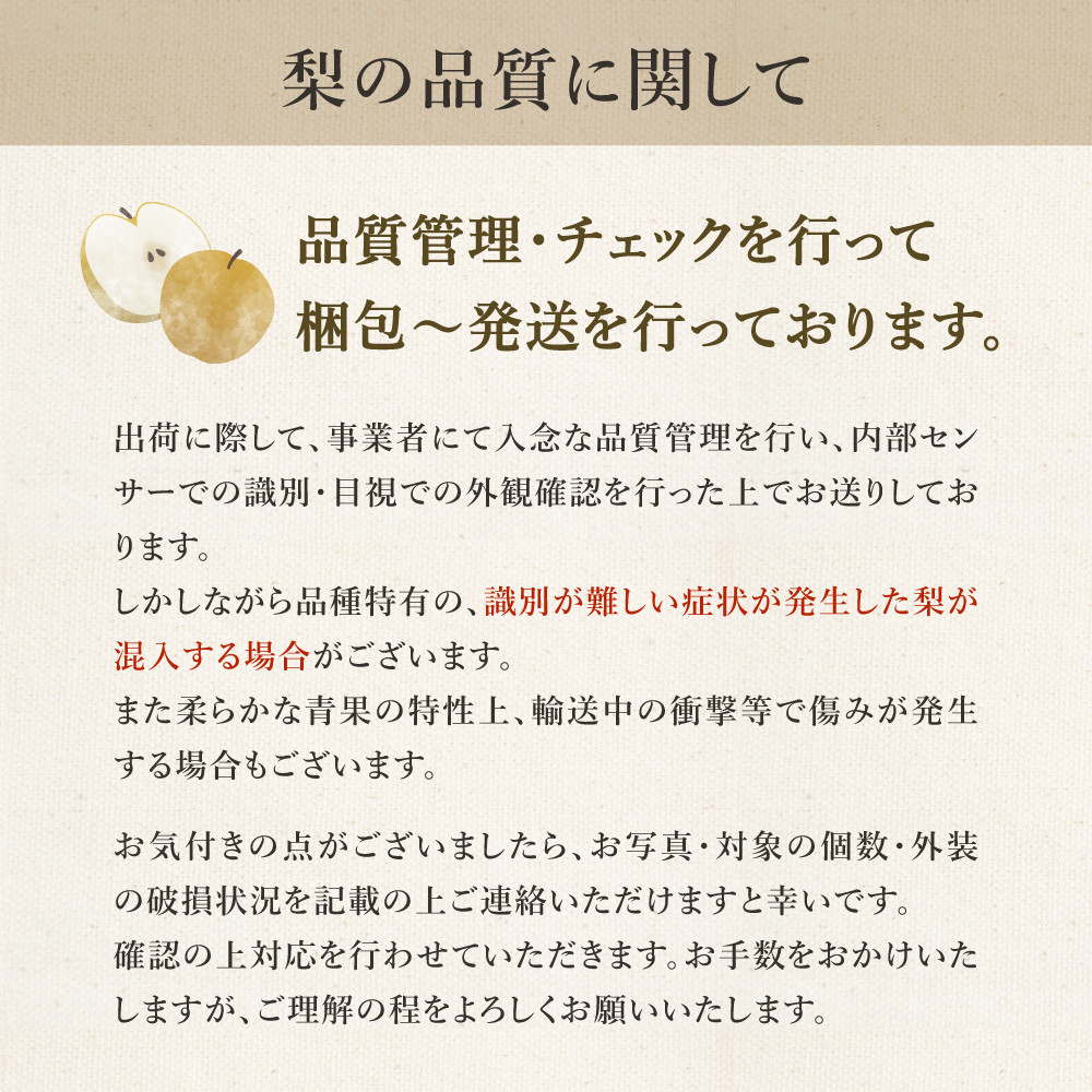 王秋梨は特にこの症状がみられやすく、食べても身体に害はないのですが、この果肉部分は食感が良くないため、該当部分を取り除いていただきますと特段問題なくお召し上がりいただけます。