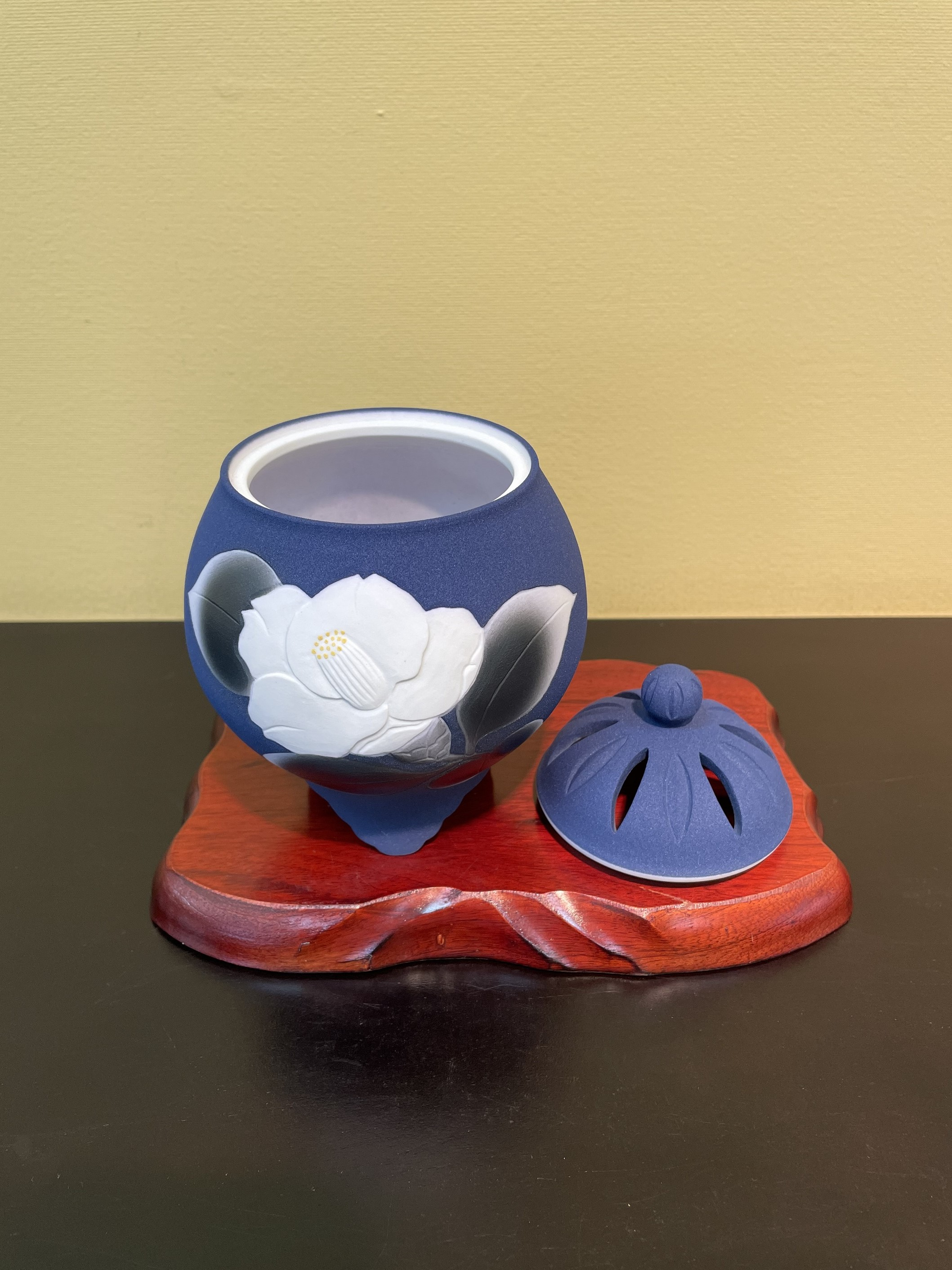 【伊万里焼】藍吹染白椿彫香炉 027-H821