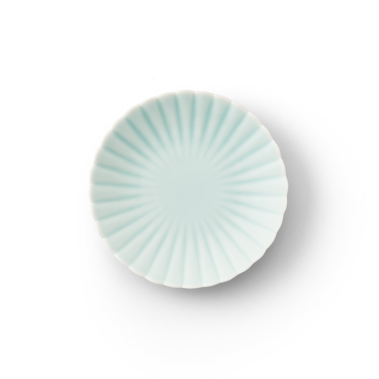 しっとりとしたマットな質感と薄緑色の柔らかな風合いが美しい Moist モイストシリーズの菊割4寸皿です。