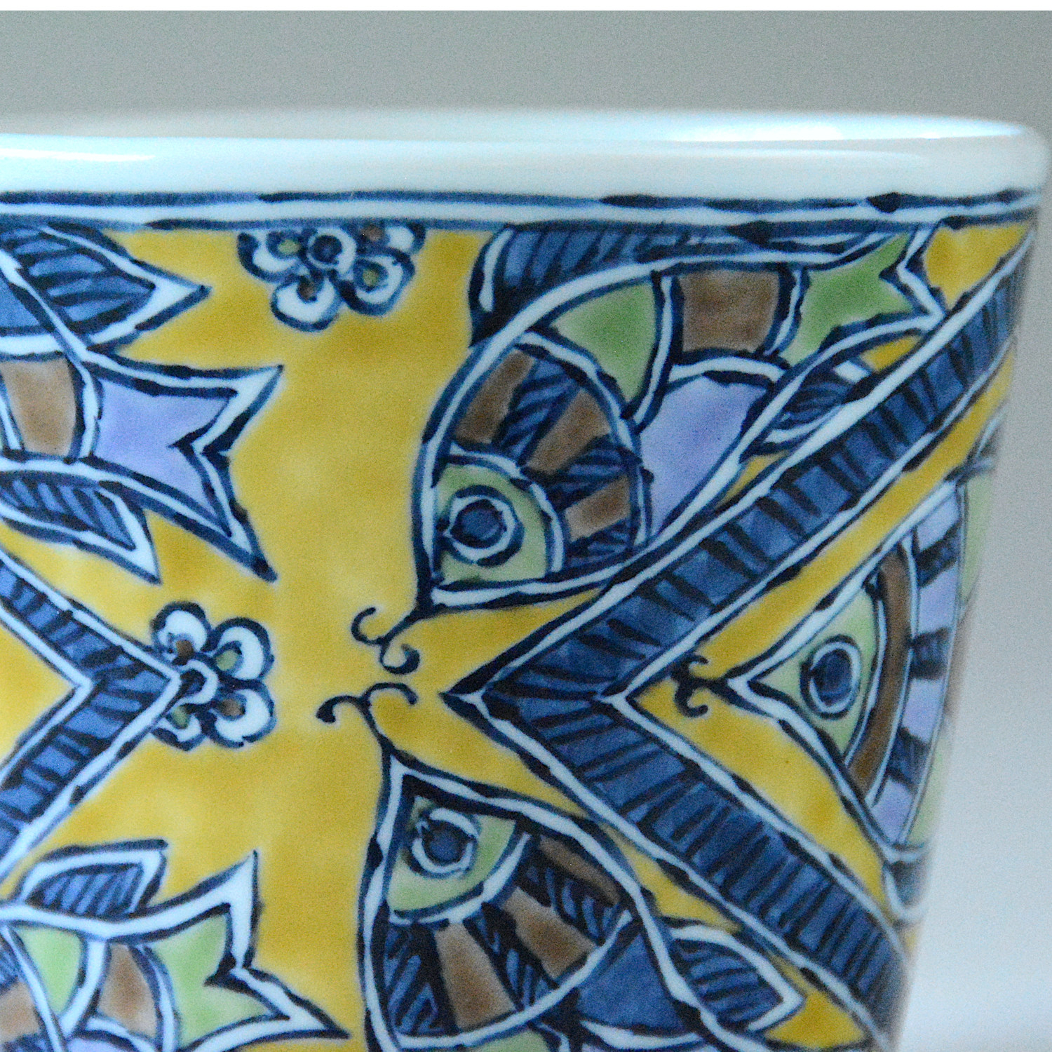 魚をモチーフにした更紗紋風のマグカップ。手描きの筆のタッチの面白さを表現した、アトリエまりゑの定番人気商品です。