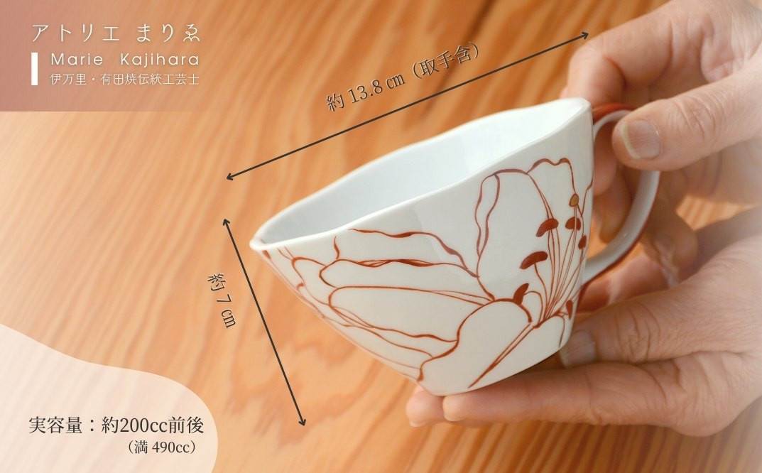 筆のタッチだけでカサブランカの美しさを表現してみました。赤と黒がありますので、ペアーにするのもお勧め。紅茶・コーヒーの他にスープ碗としても活躍します。