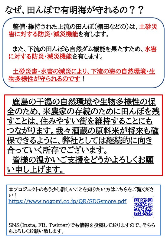 そこで、鹿島市と「矢野酒造株式会社」、「有限会社馬場酒造場」が連携し、「自然ダム」として防災・減災や環境保全効果を発揮する田んぼを維持・存続させる取組みを始めました。