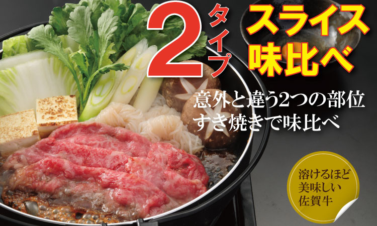 国内ブランド牛「佐賀牛」の脂肪が入りやすい霜ふりの柔らかい赤身肉で、ほどよい食感と濃厚な味が特徴の「肩ロース」と、牛の背中の部分で脂が少なくさっぱりとした味わいと柔らかな食感が特徴の「ローススライス」の二種類の部位を食べ比べるセットです。たっぷり入ったすき焼きや煮込み料理でご堪能下さい。