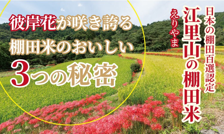 「江里山(えりやま)の棚田米」は、豊かな自然と清らかな天山山系の湧き水で育まれ、寒暖の差によって引き締まり、もっちりとした食感と甘みが特徴です。江里山の棚田は日本の棚田百選にも選ばれ、収穫前の秋には彼岸花で棚田が真っ赤に染まり美しい日本の原風景が、今も残っています。しかし、いまは高齢者だけの集落になり、もっと若者が増えるようにふるさと納税で全国の皆様の応援をお願いします。おじいちゃん、おばあちゃんが一所懸命、心を込めて作ったお米がいつまでも続きますように。