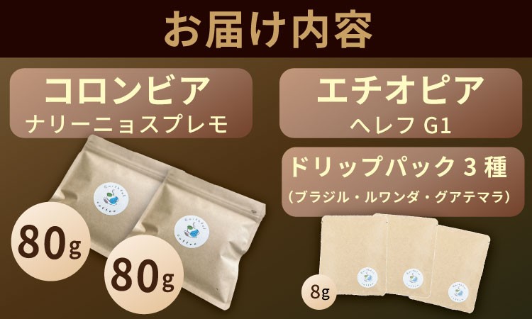 | 容量 | コロンビア:80g(粉) エチオピア:80g(粉) ドリップパック:3パック(ブラジル、ルワンダ、グアテマラ) |