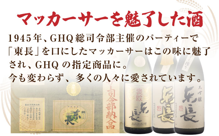 大正9年の法人化をきっかけに、当時の首相原敬より「アズマの国のオサ、すなわち東洋の王者にふさわしい」とお褒めいただき、 「東長」という名を頂きました。以来その名に恥じぬよう、美味しいお酒を作り続けています。