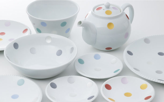 吉田地区では江戸時代より鍋島藩主の奨励で磁器産業が栄え、400年以上にわたり「肥前吉田焼」を守り続けています。戦後は、嬉野茶を特産とする地域の特性を生かした茶器を製造する窯元も多く、昭和の食卓の象徴のような水玉模様の急須や湯のみは、肥前吉田焼の代表的な商品のひとつとなっています。