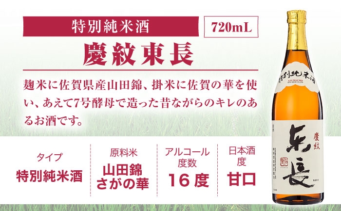 | 容量 | 以下お品を全12回お届けします。 大吟醸 東長 720ml 純米吟醸 東長 720ml 特別純米酒 慶紋東長 720ml 【原料原産地】 佐賀県産 【加工地】 佐賀県嬉野市 |