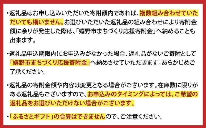 ・返礼品はお申し込みいただいた寄附額内であれば、複数組み合わせていただいても構いません。お選びいただいた返礼品の組み合わせにより寄附金額に余りが発生した際は、「嬉野市まちづくり応援寄附金」へ納めることも出来ます。