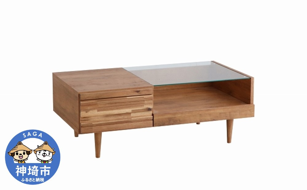 ライトブラウンのリビングテーブル、引出ガラス下のオープンスペースですっきり片付け アルグ 100リビングテーブル 【リビング 木目 ガラス センター 無垢 家具 国産 ライトブラウン】(H060308)