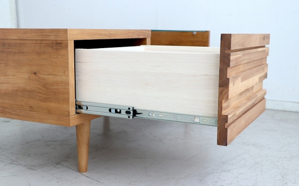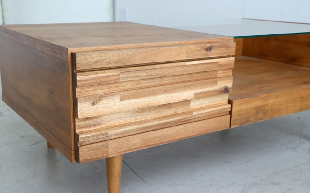 凹凸を出したアカシア無垢材が、立体感と奥行きを出してくれています。ガラス越しに魅せる収納は、引き出し機能がついており便利に活用できます。細身の脚にも拘っているおしゃれなアイテム。安心安全のF☆☆☆☆返礼品。