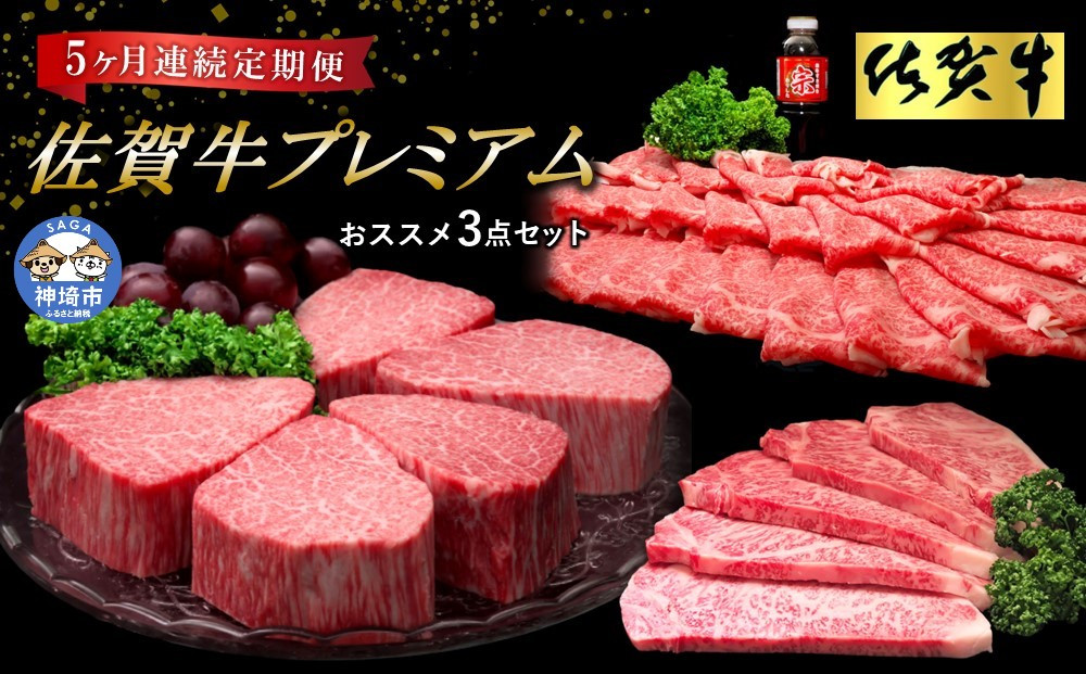 佐賀牛プレミアム 佐賀牛の至宝・シャトーブリアン オススメ3点セット 【佐賀牛プレミアム】ヒレシャトーブリアンなどオススメ3点セット【定期便5回】【シャトーブリアン 定期便 5回 サーロインステーキ ステーキ 冷凍 国産 人気 佐賀牛 ブランド牛 贅沢 お祝い 贈り物 プレゼント ギフト】(H065140)