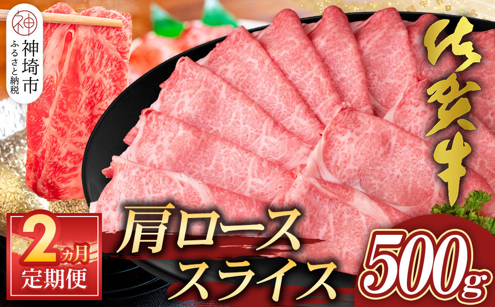 薄切りの佐賀牛肩ローススライス500gを月1回ずつ、2カ月連続でお届けします。