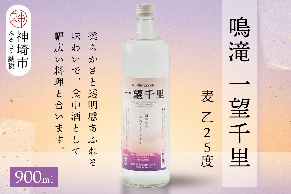 幅広い料理にあう食中酒として、お好みの飲み方でご堪能下さい。 鳴滝 一望千里 麦 乙25 900ml【酒 焼酎 麦焼酎 あまぎ二条 ロック お湯割り 水割り ふるさと納税】(H116226)