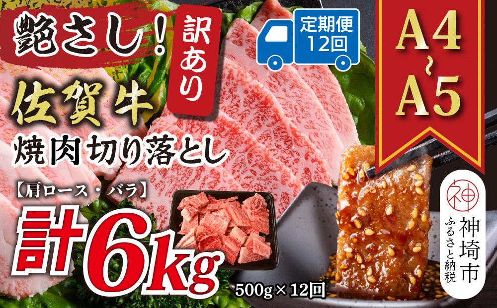 艶さし、プレミアム。佐賀県の上質な黒毛和牛【佐賀牛】をお届け致します。 【12か月定期便】訳あり!艶さし!【A4~A5】佐賀牛焼肉切り落とし(肩ロース・バラ) 500g×12回【肉 牛肉 ブランド牛 黒毛和牛 ふるさと納税】(H112240)
