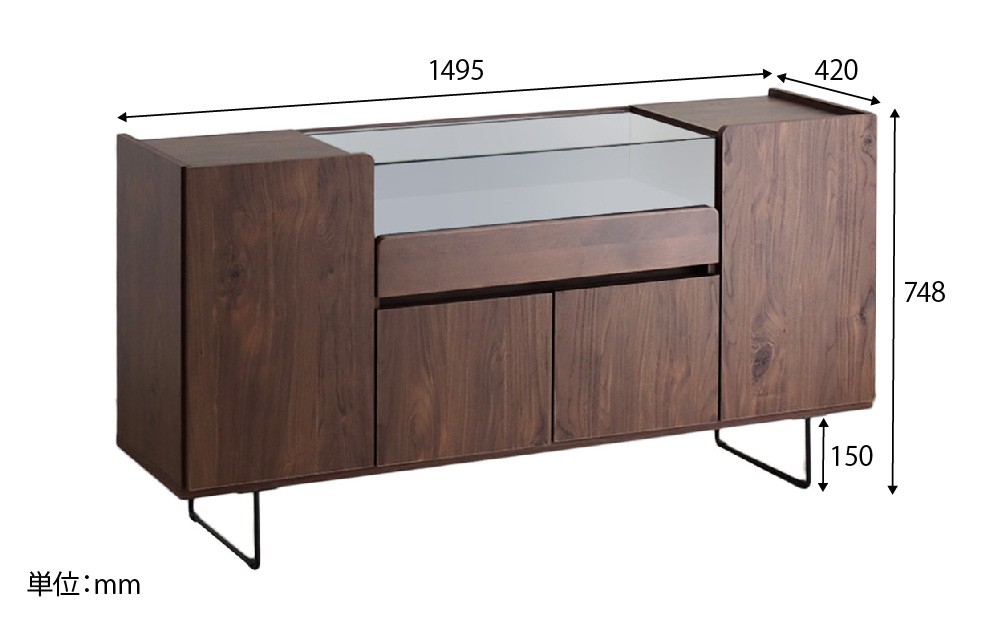 | 容量 | 【製品サイズ】 幅1495×奥行420×高さ748(mm) 【材質】 天板:強化紙化粧板 本体:プリント化粧板 前板:アルダー無垢(ウレタン塗装)/強化紙化粧板 脚部:スチール(粉体塗装) ガラス:強化6mm透明ガラス(天板) ガラス:強化4mm透明ガラス(前板) スライド棚:フェルト ○完成品でお届けします。脚部のみ取り付けをお願いします。また、梱包材については、その場で回収いたします。 |