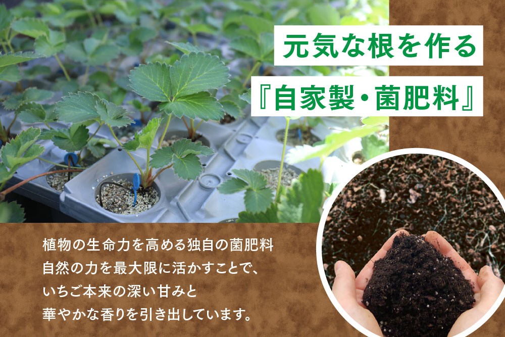 土に触れない清潔な環境に加え、いちごの根を元気にする自家製の菌肥料を使用し、