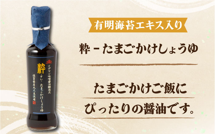 佐賀県産丸大豆醤油をベースに、風味豊かな有明海苔のエキスを加えた、たまごかけご飯にぴったりの醤油です。