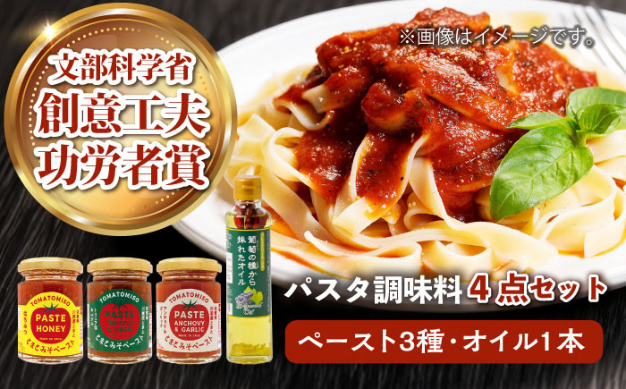 洋風料理にピッタリな4点セット登場! 【パスタにぴったり!4点セット】とまとみそペースト 120g×3種(はちみつ・トリュフ塩&バジル・アンチョビ&ガーリック)・葡萄の種から採れたオイル 170g 吉野ヶ里町/イデマン味噌醤油醸造元 [FAF034]