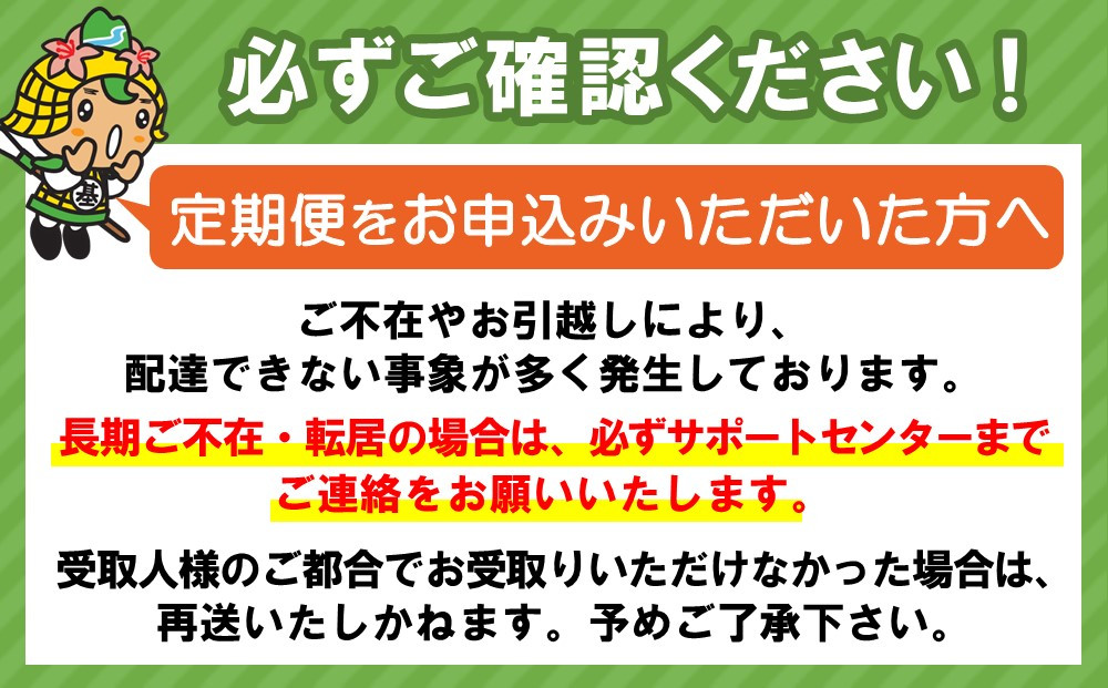 なお、長期不在等によりお礼の品をお受取りできなかった場合、再発送はできません。あらかじめご了承ください。