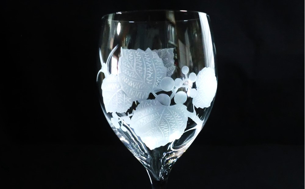 たくましく伸び栄える山葡萄を、サンドブラストの技法を駆使し緻密で繊細に彫り上げた作品です。