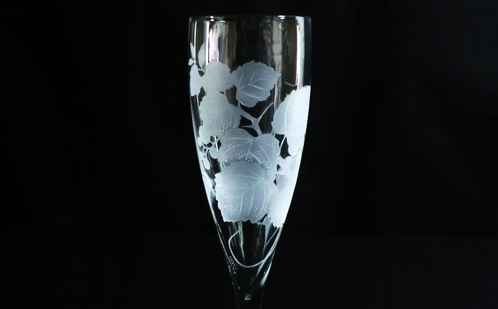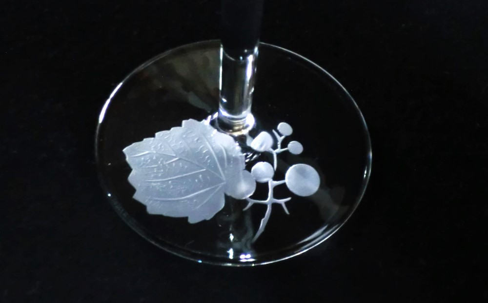 たくましく伸び栄える山葡萄の姿を、サンドブラストの多彩な技法を駆使し手仕事により丹念に彫り上げた作品です。