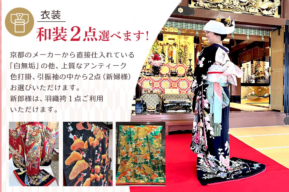 京都のメーカーから直接仕入れた「白無垢」のほか、上質なアンティーク色打掛や引振袖の中から、新婦様は2点をお選びいただけます。新郎様は、羽織袴を1点ご利用いただけます。