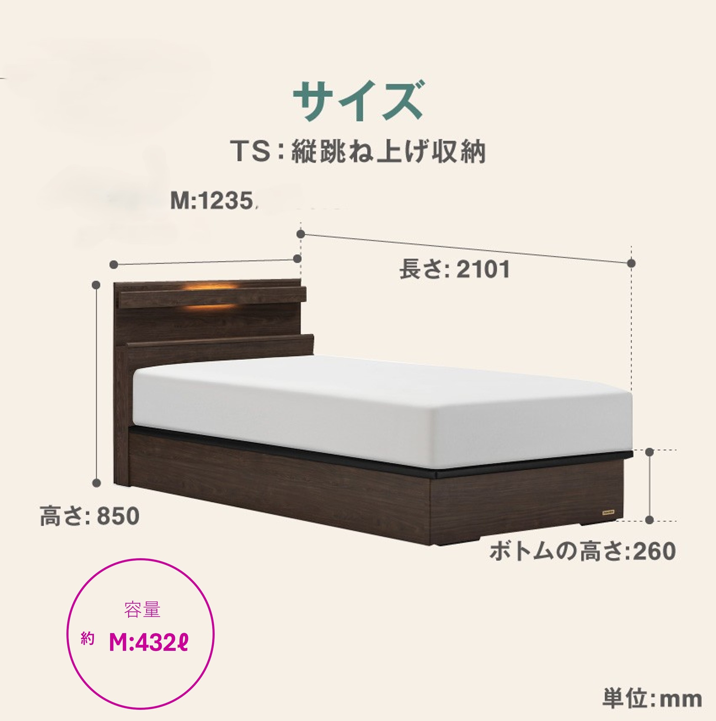 | 容量 | 【ベッドフレーム】 ・ファディア FAD-C1 TS(縦跳ね上げ収納260mm) _セミダブルサイズ (幅)1235×(長さ)2101×(高さ)850 (フレーム高)260㎜ (容量432ℓ) 【マットレス】 ・上峰町オリジナルマットレス _セミダブル |