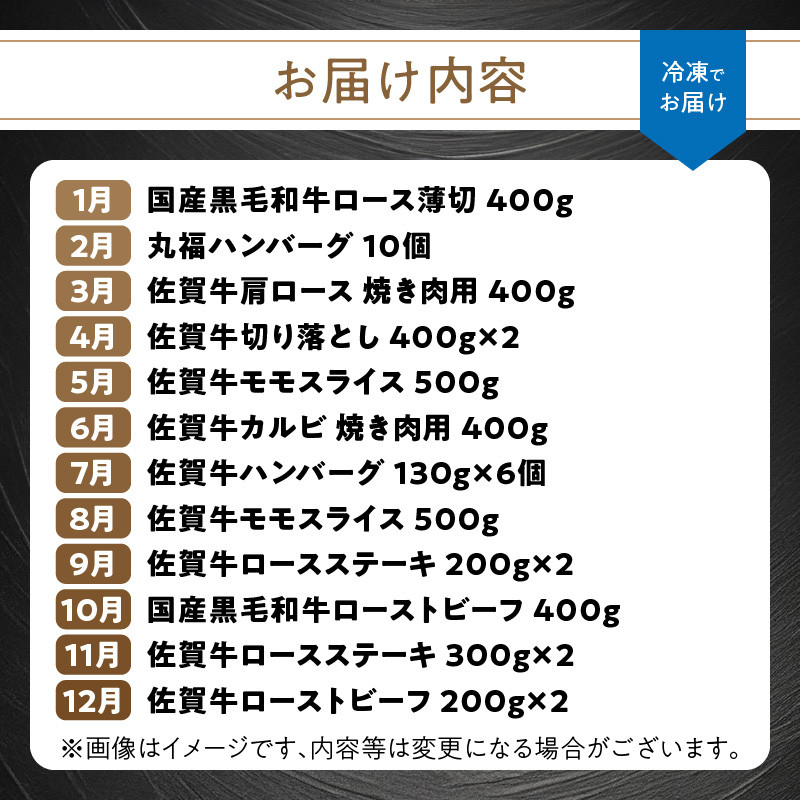 | 容量 | ◆お届け予定スケジュール◆ 1月 国産黒毛和牛ロース薄切り 400g 2月 丸福ハンバーグ 10個 3月 佐賀牛肩ロース(焼き肉用) 400g 4月 佐賀牛切り落とし 400g×2 5月 佐賀牛モモスライス 500g 6月 佐賀牛カルビ(焼き肉用) 400g 7月 佐賀牛ハンバーグ 130g×6 8月 佐賀牛モモスライス 500g 9月 佐賀牛ロースステーキ 200g×2 10月 国産黒毛和牛ローストビーフ 400g 11月 佐賀牛ロースステーキ 300g×2 12月 佐賀牛ローストビーフ 200g×2 ■配送温度帯 ・冷凍配送:1月~12月 ■注意事項 ・内容が変更になる場合がございます。 (原価の高騰による内容量の変更、天候等の影響による発送月の変更、終売による内容の入れ替え等) ・上記お礼の品は送付予定です。送付内容が変更となる場合お知らせさせていただきます。 ・その他お送りする返礼品について何かございましたらご相談ください。 |