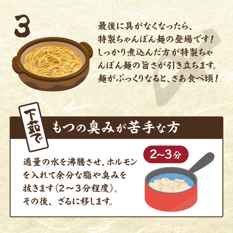 また、もつの旨みを最大限に引き出すオリジナル醤油スープと鍋を最後まで楽しめるちゃんぽん麺までセットになった、こだわりのギフトです。