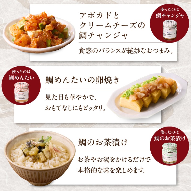 佐賀県玄海町の仮屋湾で養殖された真鯛を地元の漁師飯をヒントに新鮮なまま捌いてそぼろにした「鯛味噌バター」に加え、鮮度を保持したまま締まった切り身の漬けを贅沢に使った「鯛めんたい」「鯛チャンジャ」「鯛のお茶漬け」。ご飯のお供や、パスタ等のアレンジにも!。