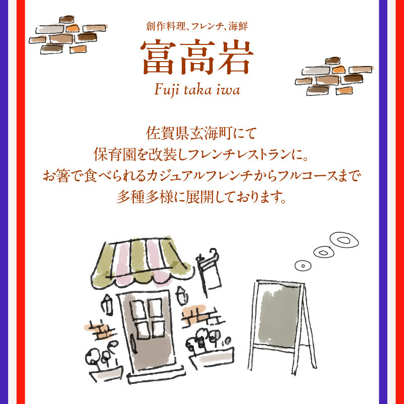 玄海町唯一のフレンチレストラン『美食倶楽部富高岩(ふじたかいわ)』の人気ディナーコースです。 元保育園だった場所を兄弟でセルフリノベーションし、2012年にフレンチレストラン『美食倶楽部富高岩』をオープン。 お料理を手掛けるのは、お兄さんの吉田シェフ。大阪・東京の有名レストランで料理長を務めた後、かねてから尊敬していた、料理の鉄人で有名な石鍋シェフのもとで再修業をつみ、その後バリ島の五つ星ホテルの総料理長を務めました。 生まれ故郷である玄海町に戻り、地元の食材を使ったフランス料理で地域を盛り上げたい!という思いのもと、58歳の時に「美食倶楽部富高岩」をオープン。 キャトルセゾンは、玄海町の食材をふんだんに使ったコースとなっております。 是非お楽しみください。 店舗情報:美食倶楽部富高岩 住 所:佐賀県東松浦郡玄海町今村 6494-1 電話番号:0955-52-3633