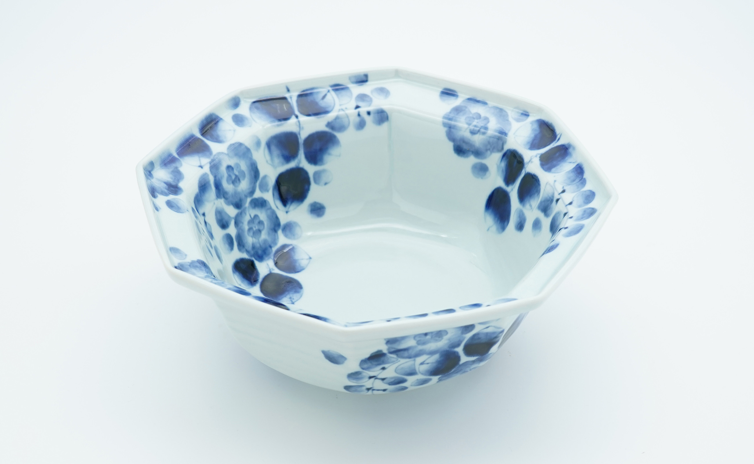 ロクロで丸く挽いた後、まだ柔らかいうちに内型にかぶせて八角に成形します。 辻が花の絵柄は染の技法(辻が花)からインスピレーション受けています。 濃(ダミ)と言われる色の塗りつぶし作業には、ぼかしという技法を取り入れグラデーションを付けています。 盛鉢として使えば食卓の華になれる器です。 作家:山口洋一