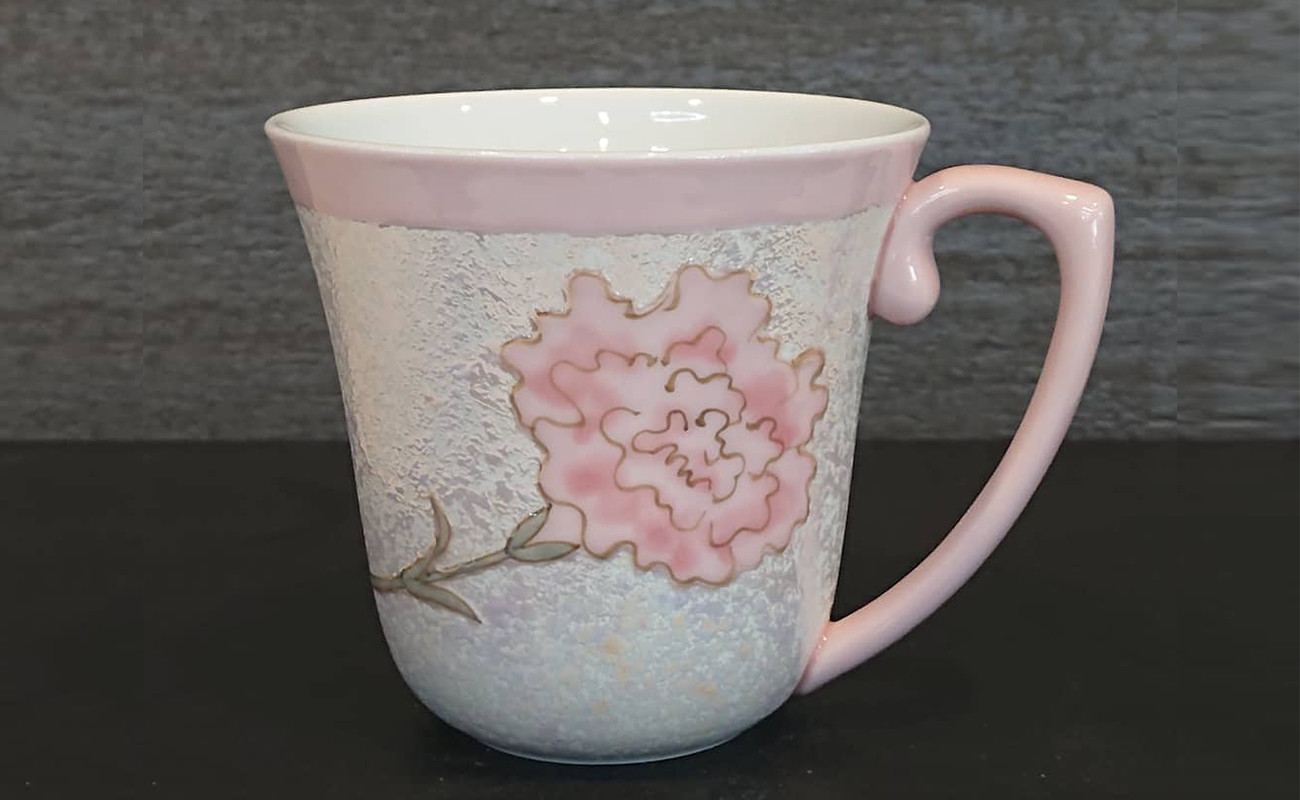 マグカップ全体にパールを吹きかけたようなキラキラと輝く 「ラスター加工」とよばれる釉薬を施し、その上に優しいピンクのカーネーションが一輪、 裏側にはつぼみが一輪描かれています。持ち手もピンクで可愛らしく仕上げています。 女性に好まれる柔らかいピンク系で母の日のプレゼントとしていかがでしょうか。 窯元:田清窯 提供:株式会社中山陶和堂