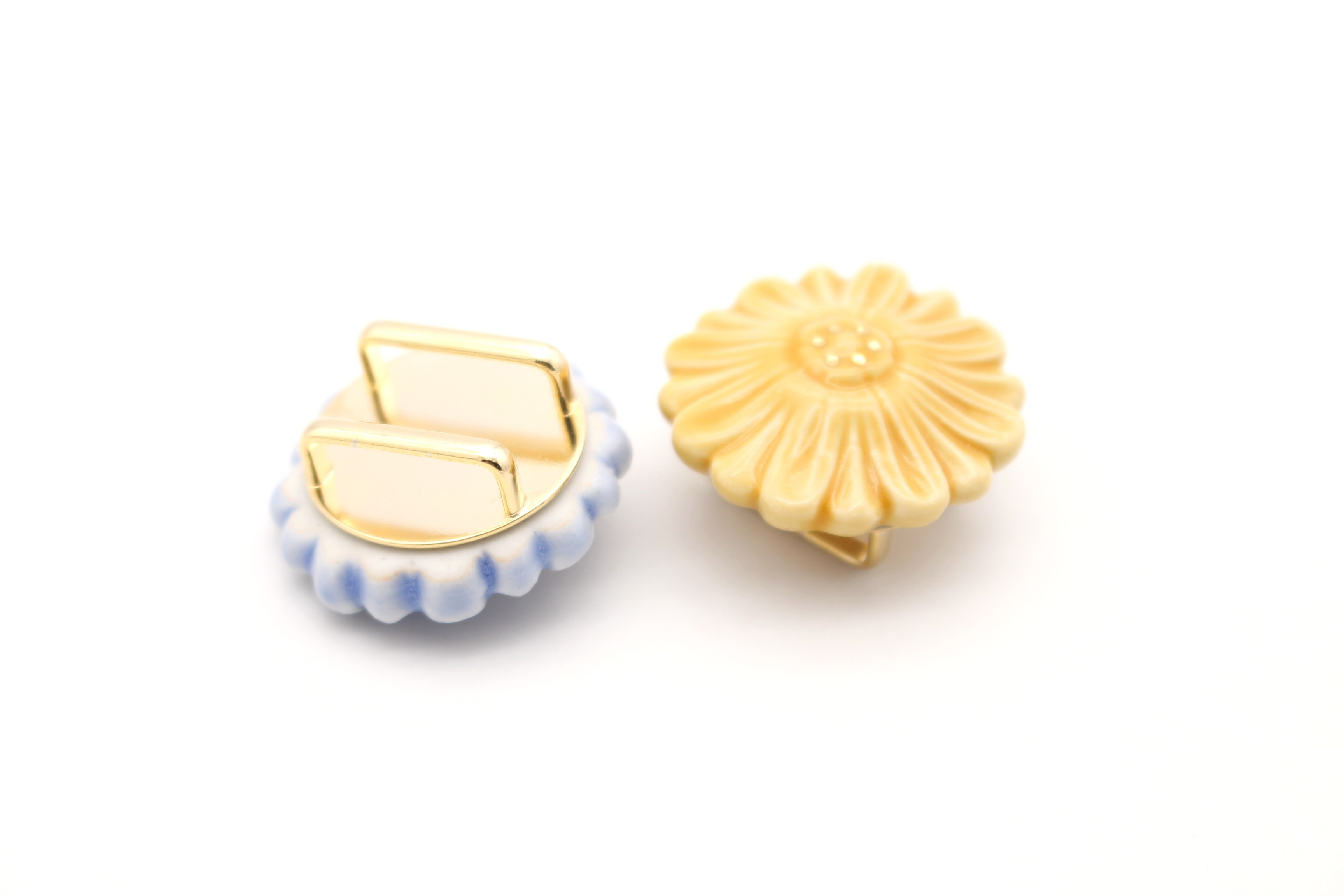 有田焼の帯留です。 マットな質感で焼き上げたパーツに、金彩やプラチナ彩を施し、 華やかな帯留に仕上げています。 提供:有田焼アクセサリーcocosara